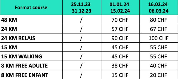 - Ravitaillements sur le parcours (km 30 à Loex, Km 39 à Aire-La-Ville, km 48 à l'arrivée à Dardagny)